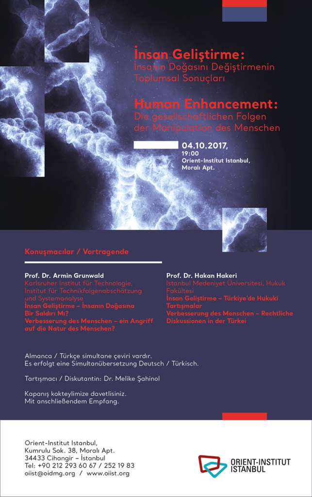 12 Ağustos 2017 İnsan Geliştirme: İnsanın Doğasını Değiştirmenin Toplumsal Sonuçları Sunumlar Orient-Institut Istanbul’da düzenlenmiş olan Doğayı Yeniden Şekillendirmek, İnsan Hayatı Geliştirmek mi? Tıp, Bilim ve Teknoloji Hayatımızı Nasıl Biçimlendirir konferans serisinin parçasıdır. Önceki Sonraki